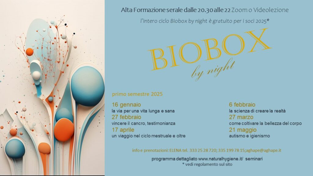 Lezioni serali di alta formazione serale zoom o videolezione, dalle 20.30 alle 22.00 progettate per offrirti strumenti pratici e conoscenze essenziali su come mantenere, migliorare e ripristinare una salute ottimale, in tutte le dimensioni della tua vita: fisica, mentale, psichica, spirituale, relazionale e creativa.